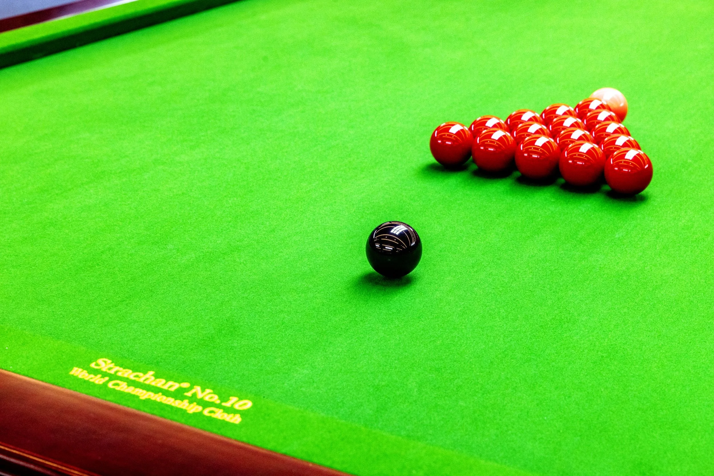 A snooker table with a black cue ball and a cluster of red balls arranged in a triangle in the corner.